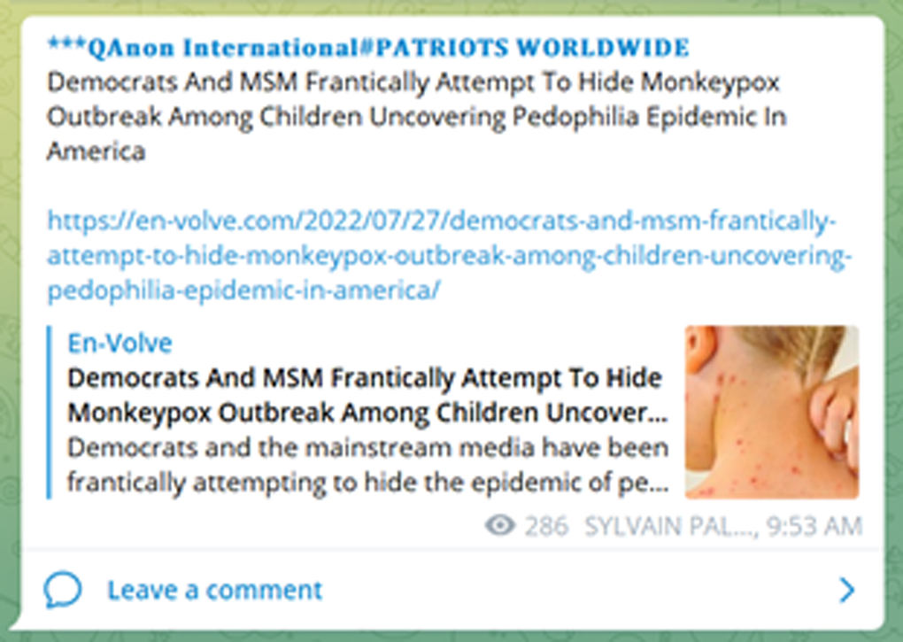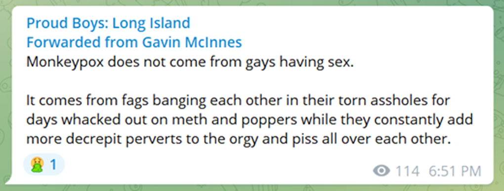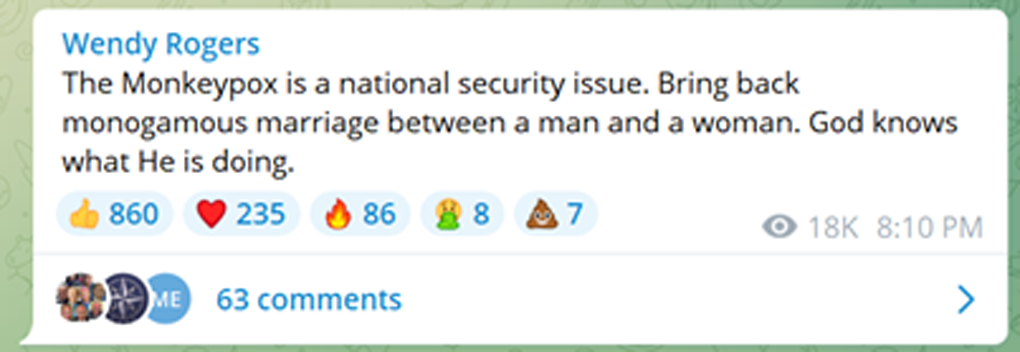 I used tweets as the primary basis for this rhetorical analysis as news coverage in 2022 labeled Twitter as one of the social platforms most susceptible to misinformation, disinformation, and homophobic attitudes regarding mpox. Since social platforms like Facebook and Instagram took swifter action to remove and combat disinformation, with many homophobic and misleading posts being deleted altogether, they were not included in this analysis. For the month of July 2022, posts from the popular right-wing social network Telegram have been included to account for the significant spike in anti-LGBTQ mpox discourse on the platform following Representative Marjorie Taylor Greene’s tweet regarding mpox late that month.
